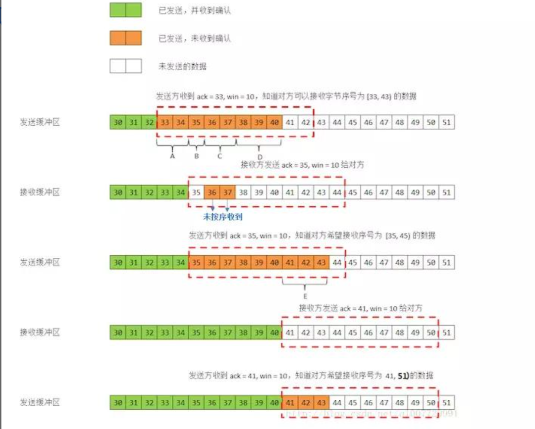 发送端发了1,2,3,4,5一共五份数据,接收端收到了1,2,于是回ack 3,然后收到了4(注意此时3没收到)此时的TCP会怎么办?我们要知道,因为正如前面所说的,SeqNum和Ack是以字节数为单位,所以ack的时候,不能跳着确认,只能确认最大的连续收到的包,不然,发送端就以为之前的都收到了。